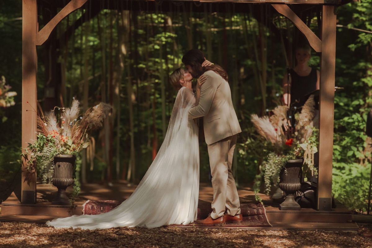 Cedar Double Doors – The bridal aisle winds through a canopy of trees, leading to a pair of freestanding cedar double doors that open into the ceremony space to create that dramatic grand entrance!
