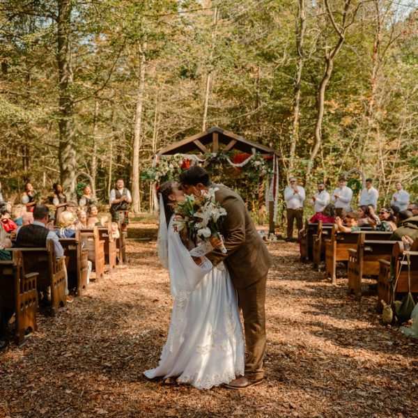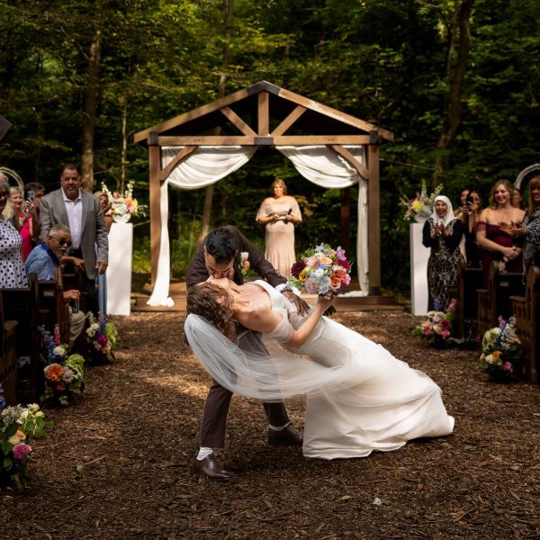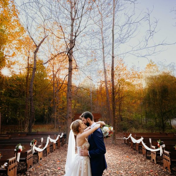 Woodland Setting – Our unique outdoor wedding ceremony space is the ultimate romantic setting to exchange your vows! This whimsical wooded area is surrounded by trees near a winding creek. “Floating” farmhouse windows are suspended from wire along the perimeter to create a defined space while adding a touch of charm.